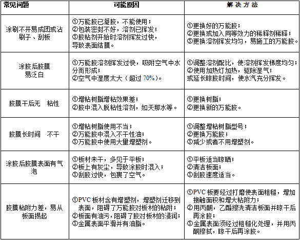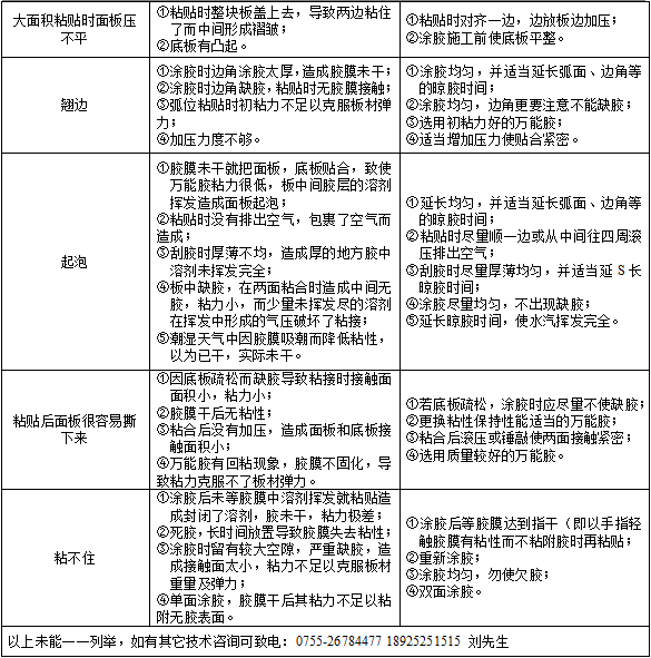 粘合時要注意對準位置,一次粘合成功。粘防火板、鋁塑板時,不要水平粘下,以免將空氣封閉在板內形成氣泡,要從一端開始,慢慢粘合至另一端。